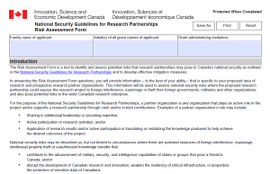 “By completing the form, users help ensure that collaborative research does not inadvertently expose projects—or Canada’s broader innovation ecosystem—to threats like unauthorized knowledge transfer or interference by foreign actors.”